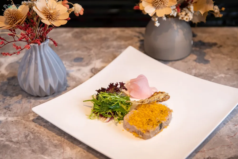 說實話,這道前菜的名稱與外觀都讓人覺得奇妙並充滿想像,聽主廚說這道菜經過反覆測試了半年多才推出。內容物有搭配脆瓜的自製瓜仔肉、天婦羅脆片、法式芥末醬、以及利用紅酒醋醃製的蘿蔔與紫洋蔥,主廚建議全部一起搭配食用,以清爽的酸為主軸,有種特別的香氣在嘴裡散開,這特別的調味組合,十分可口。