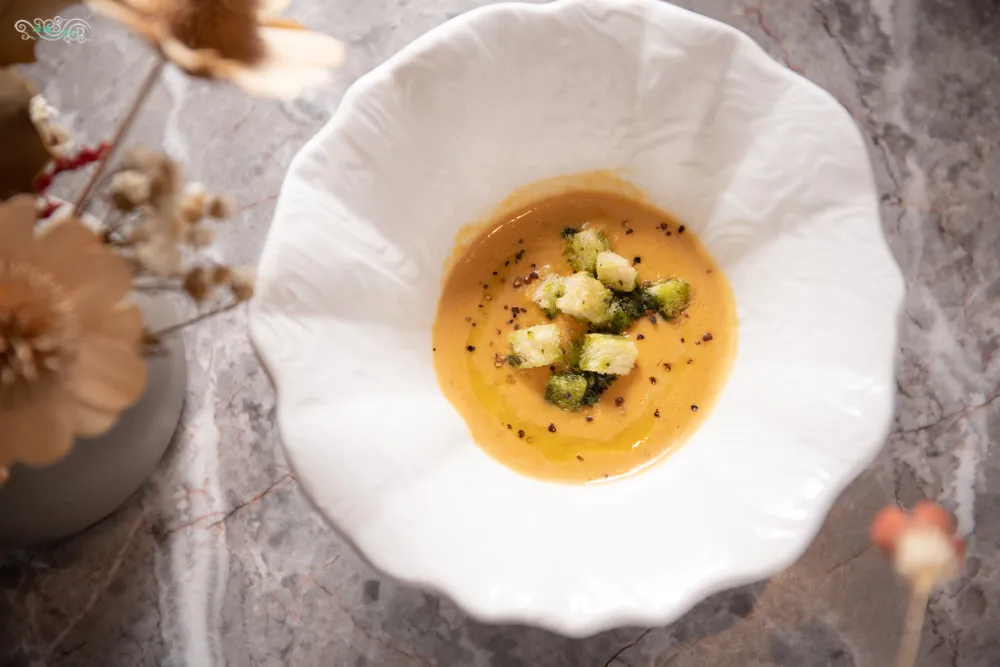 由法國進口的紅椒煙燻奶油,相當綿密完全沒有顆粒的感覺,長棍法式麵包超香又酥脆,搭配濃湯與奶油一起食用,滋味更優,感覺配什麼湯都能替美味加分不少,深得友人歡心的長法麵包是可以續加的喔。