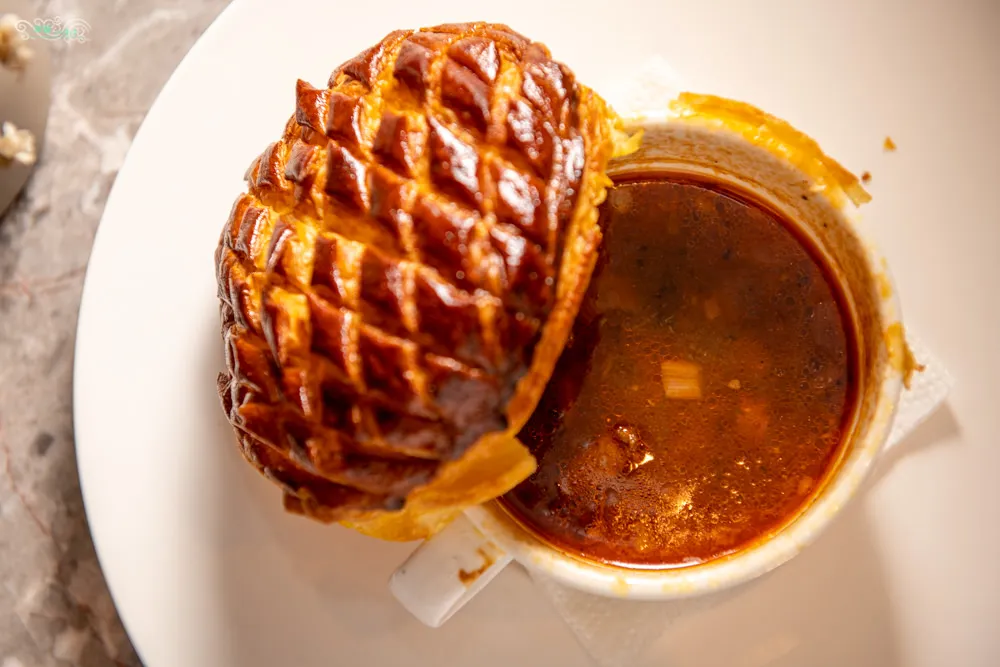 以蔬菜料與牛肉熬煮的牛肉高湯,上方是酥脆的金黃色酥皮。牛肉燉的軟嫩還保有嚼勁,酥皮烤的恰到好處,是道十分稱職的餐前湯品。