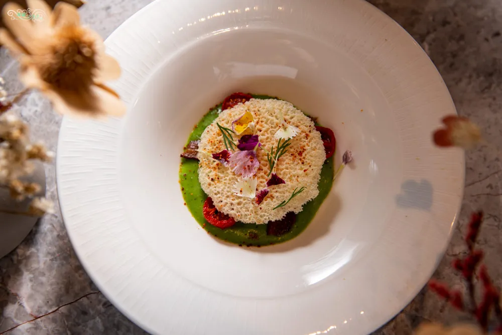 這是道擁有濃厚藝術氣息的菜色,用心的食材與巧妙的色彩相互輝映。在鮪魚生魚片上放了一顆Ricotta起司,搭配番茄切塊、生菜並淋上檸檬油醋,外層那一絲一絲的是檸檬皮,透過油封的方式製作的前菜。外圍綠色的油是利用香料油、巴西里根的中段與一些綠色植物,在瀝乾過濾後濃縮而成,巴西里與薄荷的香氣十足,吃在嘴裡滿是香味,那一點點酸與一點點甜,構成一幅饒富樂趣的酸甜味道百科。
