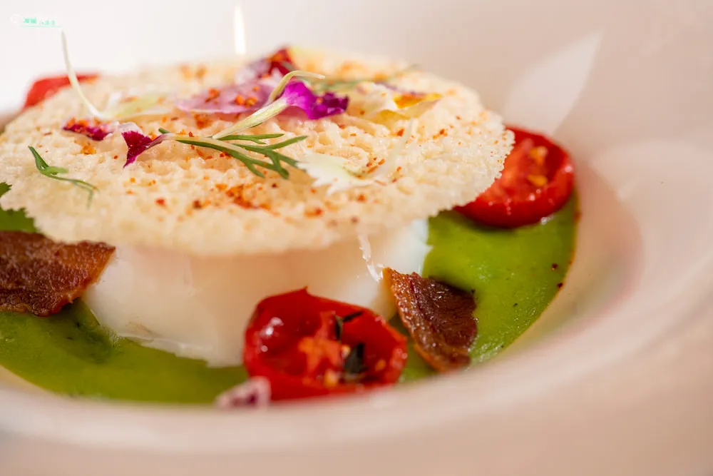 送上桌時盤子還熱熱的,目的是要保持食材的溫熱度。最底下的青豆泥,軟糯的口感吃起來味道很特別,提升了培根與風乾番茄的滋味;中間的溫泉蛋火候掌握的很好,送上桌時因為搖晃還有著明顯的ㄉㄨㄟㄉㄨㄟ感說,嚐起來非常綿密細緻;最上面的是帕馬森起司,看起來彷彿很脆,吃起來卻相當綿滑。直接一匙全部一起入口,濃郁的蛋香滑嫩入口,在快入喉時帕馬森起司那種清新的乳酸香甜才突然突顯出來,整體風味的變化非常豐富,兼具視覺與味覺的美妙味蕾旅程。