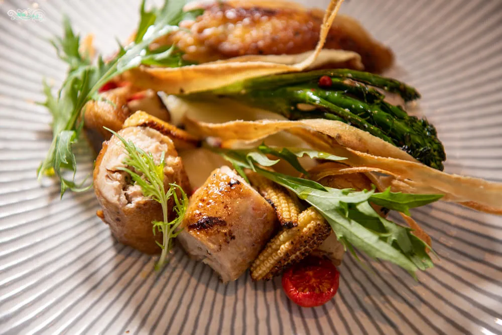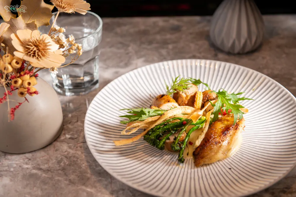 將雞肉作兩種烹調處理,一個是連皮一起烤的雞肉捲,一個是煎雞胸,搭配蘑菇、玉米筍、火箭菜與風乾番茄等時蔬以及牛蒡脆片,最底下鋪著馬鈴薯泥。咬下會噴汁的蘑菇,與帶點焦味的玉米筍有著明顯的對比;帶骨的雞胸肉事先泡在含有豐富蔬菜的雞高湯內一個晚上,在出餐前才把骨頭處理掉,超甜嫩多汁的煎雞胸,吃起來有種難以言喻的鮮甜味,纖細柔軟滋味鮮嫩,每一次的入口都能感受到肉質的鮮甜,讓友人驚呼連連。