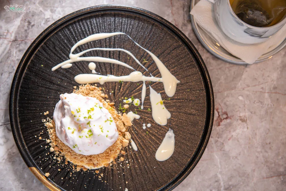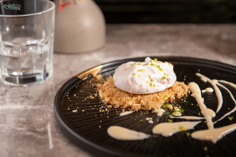 運用土雞蛋的蛋白加熱後,拌一些柑橘等水果製作的雲朵漂浮,在底下扮演海洋角色的是檸檬奶油醬與餅乾碎,這是道手工煩絮的甜點。雲朵蛋白入口即化,淡淡的檸檬香氣與酸味,與不一樣酸香的柑橘,交互刺激著嗅覺與味蕾,輕巧的酸激起甜的漸層漣漪,柑橘與檸檬各自表述卻又互不搶味,堆疊出相當立體的層次,最後入喉前有種很特別的甜味湧現,一場變化萬千的美味體驗在味蕾上精彩上演,凌雲非常願意為了這道甜點再次光顧。