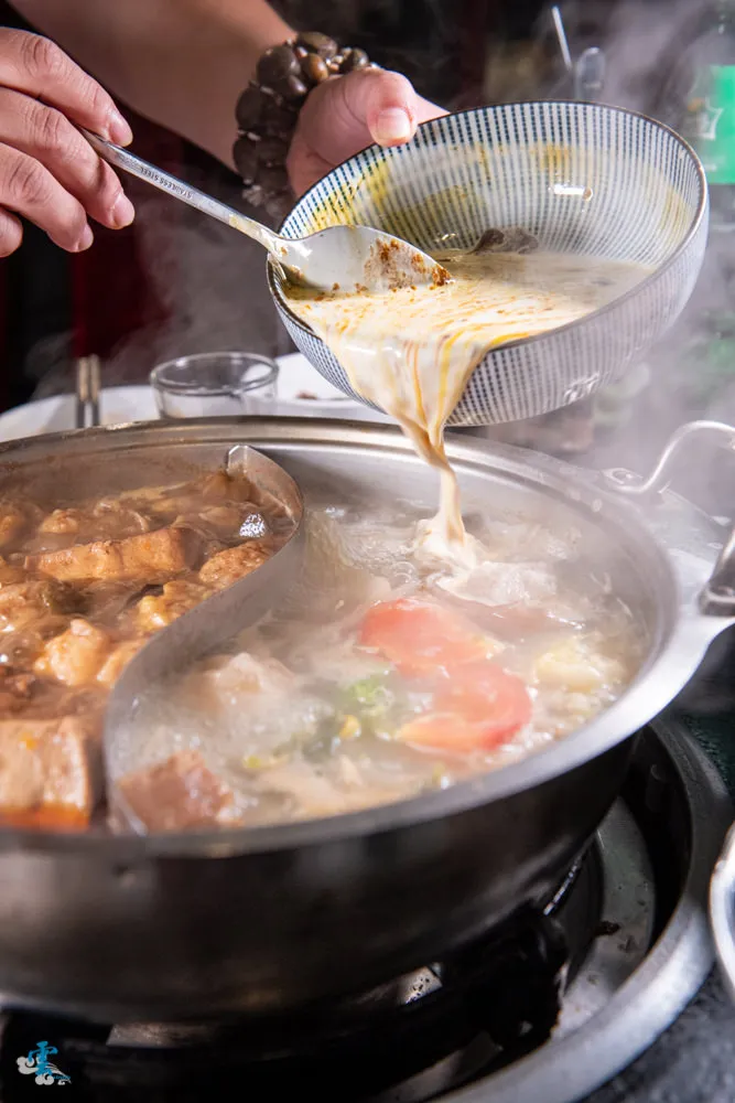 凌雲這一晚來嚐嚐私宅打邊爐相當知名的一鍋三吃,是的~就是一鍋三吃,不同於一般坊間的一鍋兩吃,究竟是怎麼吃的呢?首先店家送上一鍋有著兩種湯底,分別是重慶古傳川味麻辣鍋與港式西洋菜皮蛋清湯鍋,還送上一碗白白的咖哩配料,在品嘗完港式清湯鍋後,只要在清湯中倒入咖哩配料,立馬變成香江黃金香濃咖哩鍋。