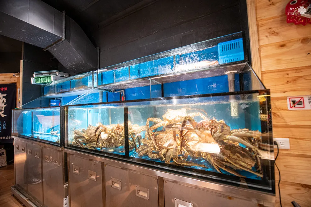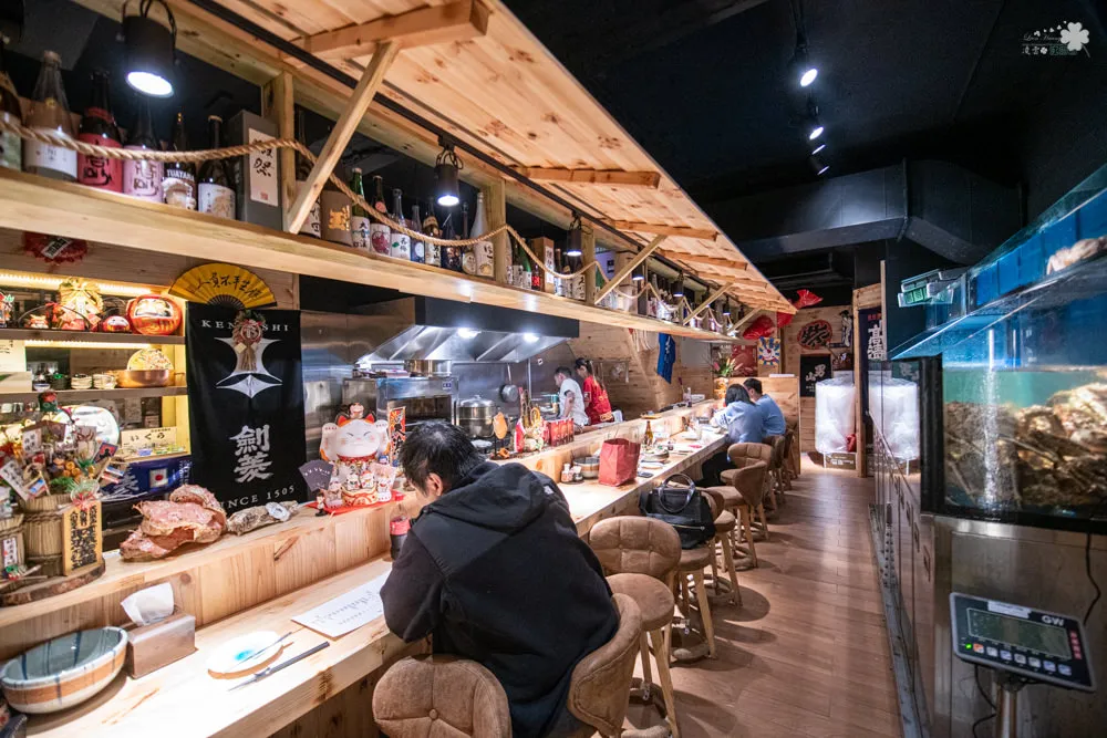 二店建一水產其實就在微風建一食堂附近而已,同樣都隱身在靜逸的巷弄間,搭乘捷運從忠孝復興站或南京復興站走過來時間都差不多,約莫10分鐘可抵達。濃濃日本風的店面配上暖色調的投影燈,在這條街上感覺頗為醒目,店內只有10個席次,日式居酒屋常見的長條形吧台設計,座位後方是各式活體海鮮,主題相當的明確。