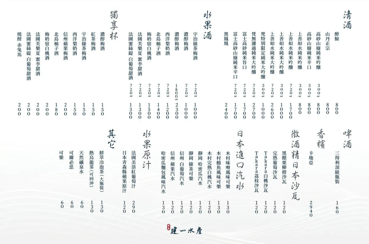 日式裝潢卻有著歐美式的食用方式,歐美人士去海港邊的海鮮市集,喜歡甚麼就買甚麼來料理,直接在海港邊食用,現在建一水產直接簡化了這個步驟,畢竟所有海鮮擺在那,新鮮度多少會有差。現在就是在顧客就定位後,店家在你訂位時間的前30分鐘才開始處理你的料理,保證讓顧客吃到最新鮮的食材,如此嚴格控管食材的鮮度,也省去顧客挑選食材的時間,建一水產依據選取價位的不同,幫你配好食材內容,共有2000、3000與4000的價位選擇,如果有額外喜歡的食材請另外單點。