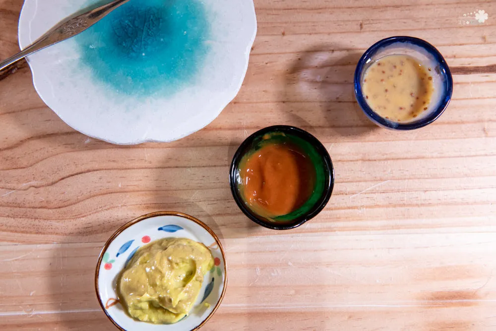 醬料有八種,可以任選三種,共有日式薑醋、味噌芥子、紫蘇桔醋、玫瑰胡麻、咖哩風味、洋風酒醋、微辛雞尾酒與柚子酪梨可以選擇。今夜的選擇是微辛雞尾酒、柚子酪梨與味噌芥子,同行友人喜歡海鮮的原味,凌雲則是適時的沾取。