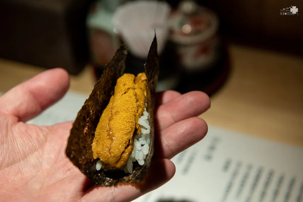 帶點溫度的醋飯,鋪著冰涼的海膽,這樣的組合才是最佳美味。細緻滑嫩的海膽,在微酸甜的醋飯的簇擁下更加甘甜,入口即化的口感與有彈性不濕軟的醋飯有著顯著的層次,海苔帶來酥脆的口感,讓整體層次更為豐富。