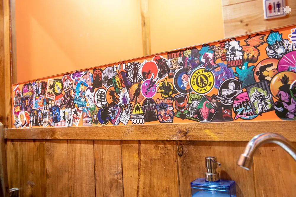 在離去前上個廁所,發現廁所牆上有著老闆的喜好七龍珠貼圖,細看之下其實也呼應建一水產的精神,七龍珠是來自日本的漫畫,牆上的貼圖文字卻都是英文,就跟建一水產一樣,日式的裝潢配上歐美式的料理食用方式。