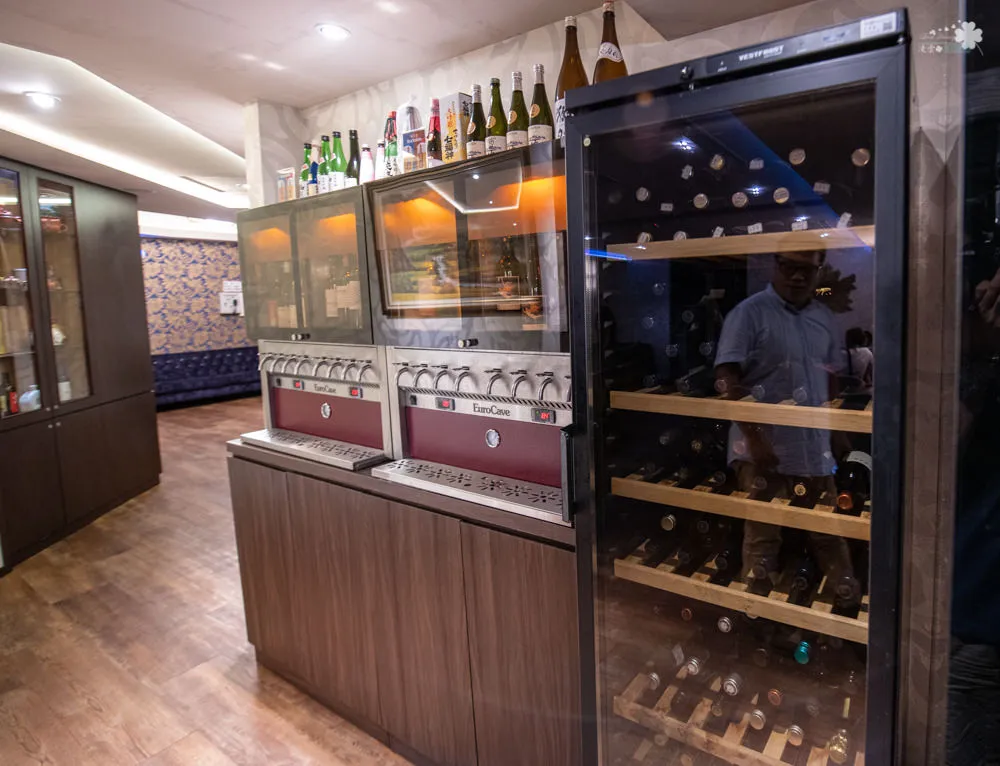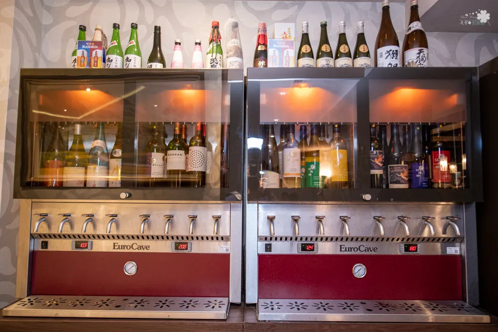 老闆更斥資百萬購入兩台Eurocave Wine Bar單杯機機台,提供新舊世界8款葡萄紅酒、4款白酒以及4種清酒,8款世界各地之紅葡萄酒分別是卡本內蘇維翁Cabernet Saivignon、梅洛Merlot、西哈Syrah、黑皮諾Pinot Noir、馬爾貝克、佳美娜、山吉歐維榭、田帕尼優Tempranillo,4款白酒則是白酒就有夏多內Chardonnay、灰皮諾Pinot Gris、德國灰皮諾Grauer Burgunder、義大利菲亞諾Fiano,至於哪4種清酒,那晚凌雲只品味了其中一種,容後介紹。透過Eurocave Wine Bar單杯機,以氮氣充填的方式讓紅白酒的風味可以保持三周,老闆如此用心,就是希望大家都能找到自己喜歡的的口感,餐酒的Marriage !