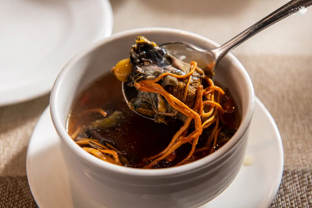 上面加了金蟲草,具有豐富的蛋白質,用來調味與提味。燉到軟嫩的烏骨雞吃起來有入口即化的口感,有點脆的金蟲草增加點層次感,湯頭甘甜清香,暖胃又暖身。