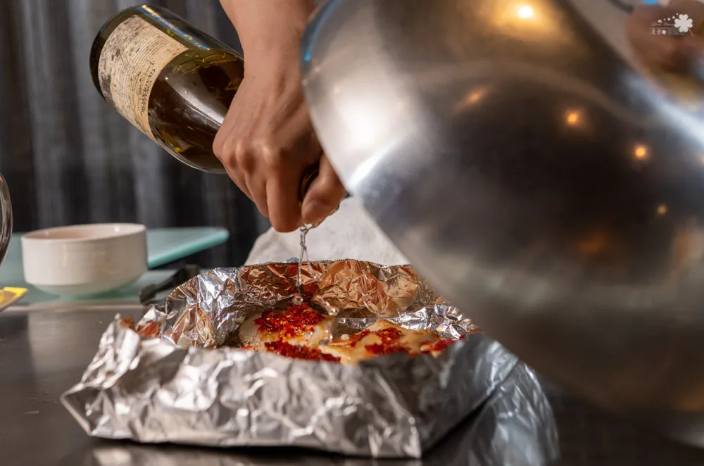 選用來自台灣南部的生蠔,透過創意在其上加了一些湖南的味道,提升並展現台灣在地食材的風味。上面有著主廚特製的蒜蓉辣椒,凌雲喜歡這種輕微的辣度,咀嚼中帶出淡淡的蒜味,味道與香氣十足,吃得到牡蠣的鮮甜,海味與蒜辣在嘴裡層層交疊,美妙滋味更上一層樓。