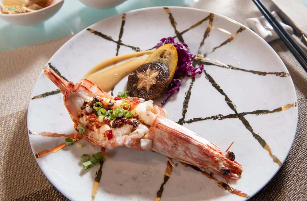 大尺寸的野生明蝦,在剖開的蝦背裡加入以花椒為底的辣椒,在鐵板上滋滋作響,最後淋上特調的醬汁。香菇、櫛瓜、醃漬鳳梨、梅汁醃漬的紫高麗與蜂蜜芥末醬,五彩繽紛的擺盤與麻辣香氣,讓視覺與嗅覺得到了滿足。第一次入口時,辣椒味道很重,花椒的香氣盈滿口腔,蝦肉肉質結實且富有彈性,在入喉的時候,麻的感受才突然湧現,在吃第二口,麻辣的感受在舌尖就體現到了,很奇妙的層次味蕾之旅。麻辣的尾勁相當夠味,可以用帶點甜味的蜂蜜芥末醬來淡化麻辣的效果。