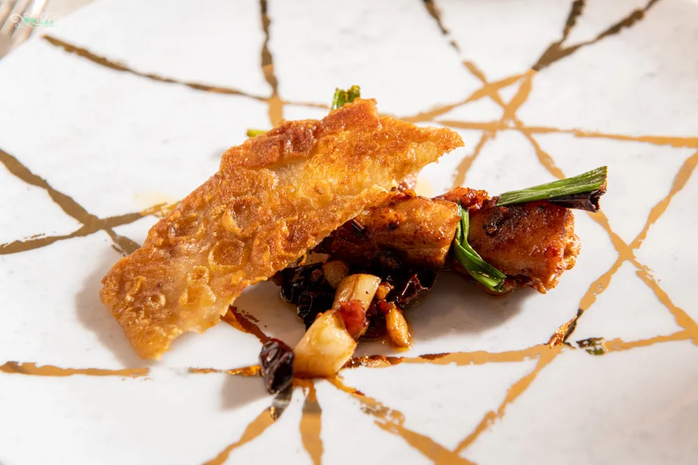 將圓鱈先煎至快熟時,加上特製的剁椒醬,在一起蒸過,讓鱈魚與剁椒醬交互融合。配菜有橘色的木瓜莎莎醬、玉米筍與紫薯,透過主廚精心的擺盤,讓剁椒蒸魚膚不只美味更賞心悅目。細緻柔軟的圓鱈肉質,帶有豐富的油脂,可以用輕巧的金桔酸做適度的平衡,紫薯與玉米筍帶來不同的風味,這道屬於會讓人鼻頭冒汗的中辣程度,那帶著酸味的辣度侵襲味蕾,讓人直呼過癮,此時師傅特調的木瓜莎莎醬就有他的妙處,木瓜莎莎醬木瓜味不甚明顯,單吃就很好吃,重要的是他有解辣的效果。