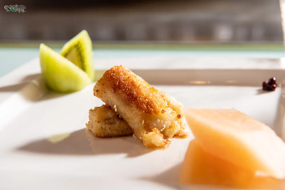 香蕉沾粉下去煎炸,在淋上蜂蜜與無鹽奶油增添甜味,最後撒上芝麻帶上香氣。外酥內軟的香蕉,有層次又輕巧的激起甜的漸層漣漪,這樣的甜點深得人心啊。