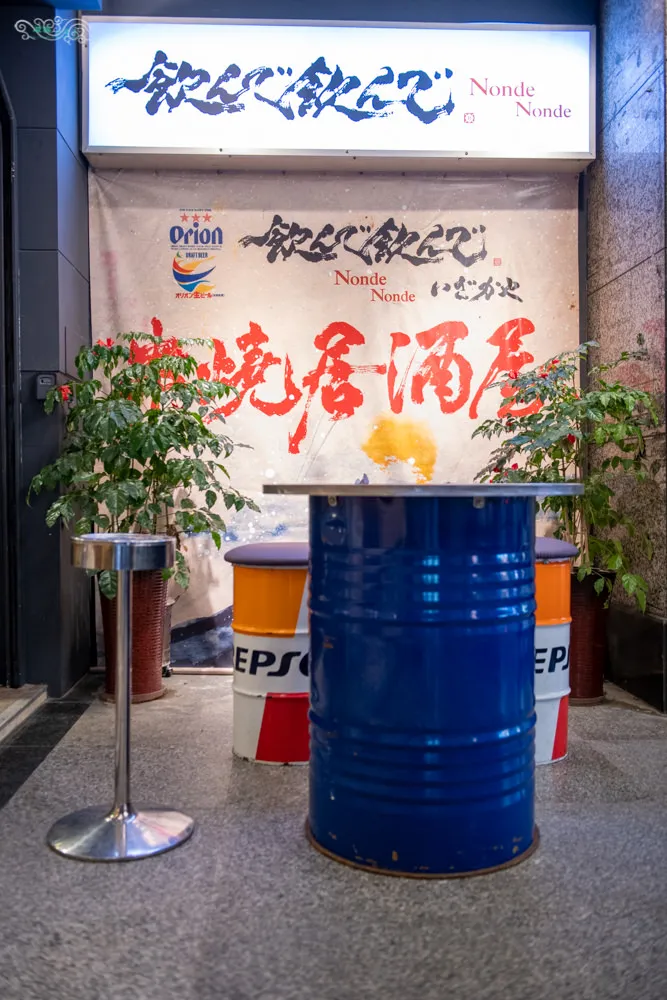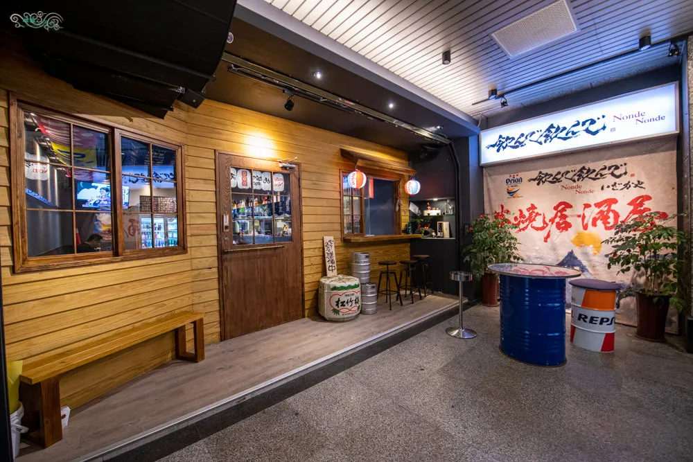 飲んで飲んで串燒居酒屋距離捷運永安市場站,走路約莫8分鐘路程,滿是日式風情的店面外觀,讓人經過時都不免會回望一下。略為內縮的大門旁,設計一張等候區長椅,一旁附有專屬的吸煙空間,牆壁上斗大的招牌璧掛,令人印象深刻。