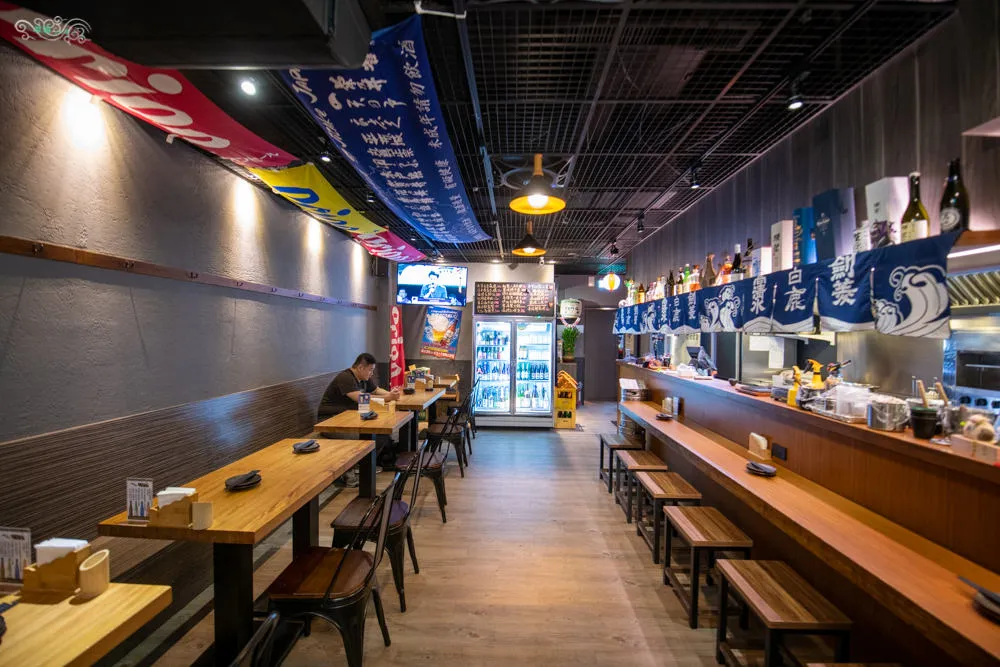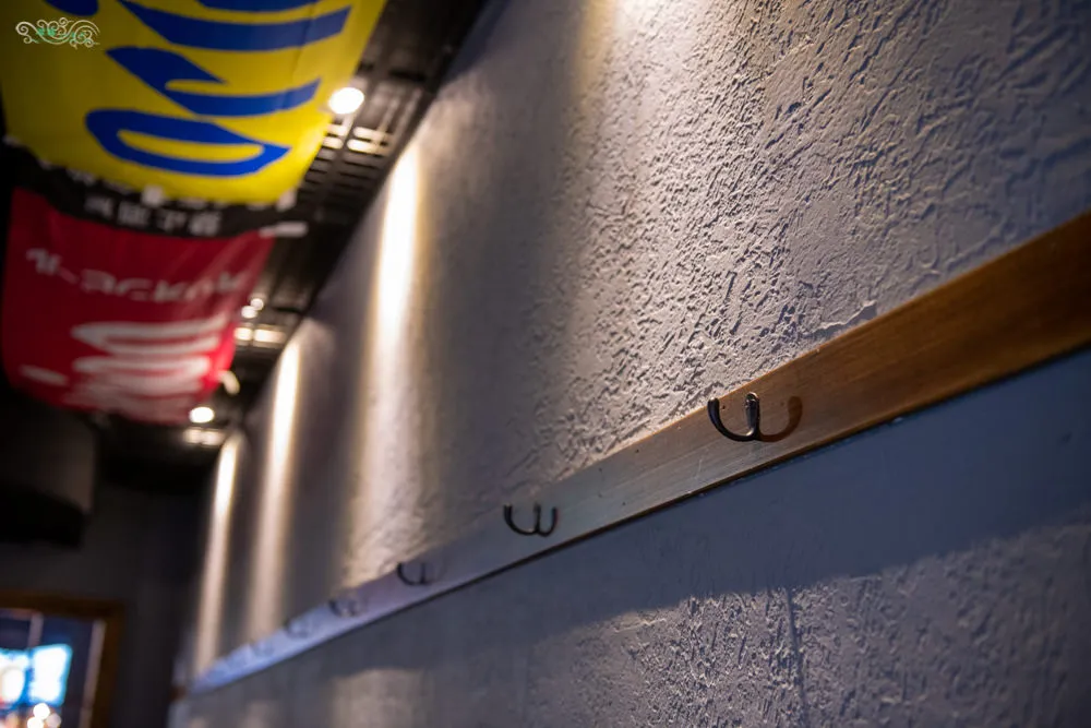 一推開大門,右邊是日式居酒屋常見的長條形吧台設計,左邊則是輕工業風格水泥裸牆,黑色系的天花板保有工業風格的鐵件裸露,在以黑色烤漆網格鐵件披掛著布條,演繹輕工業運動風格,透過溫潤的木紋桌椅與暖色系燈光,讓空間兼容溫和與個性的多元樣貌,看似日式居酒屋卻也有點運動吧的味道,相當有意思的裝潢設計。最裡面有個獨立的私密包廂,有電視有長桌,包廂的低消為一萬元,想要使用包廂請先預約,弄爹居酒屋可依預算客制化菜單。當晚包廂內已有客人,所以不便打擾拍攝。