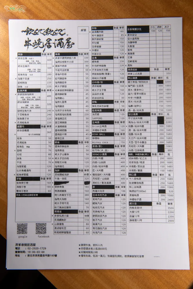 一大張的弄爹居酒屋菜單,分門別類的區分各種菜色,讓你很容易就可以找到喜愛的餐點。除了菜單上的菜色以外,冰箱上的黑板還有弄爹祕製小菜,都是當天採買的新鮮貨,數量有限,喜歡要趕快下手啊,如果沒有了,服務人員會在價錢上面打個X,那就只能等改天看還有沒有囉。禁帶外食與飲料,自帶酒水每人低消600元。