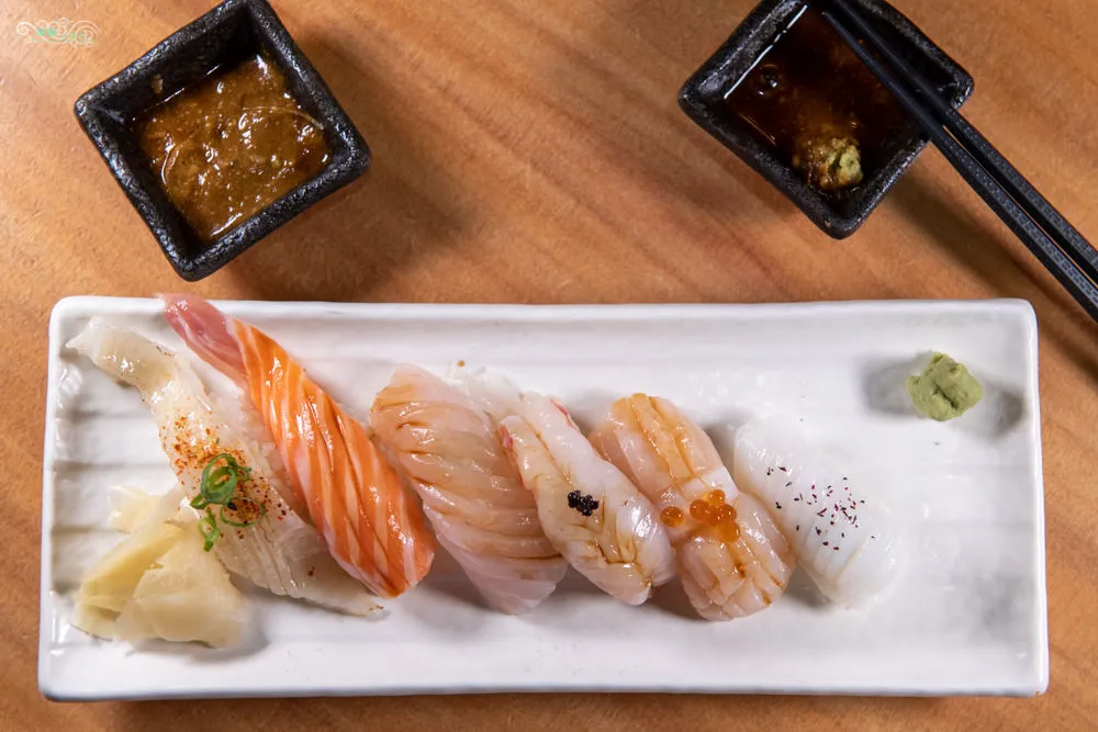 相當有意思的菜名,全是當天採買的新鮮食材,所以也算是一種無菜單料理,這一夜的內容有比目魚、鮭魚、紅甘、天使紅蝦、干貝與花枝。比目魚緣側有著豐富的油脂,添加少許七味粉調味,帶出比目魚的鮮甜,入口即化的美妙滋味,十分引人入勝。鮭魚綿密滑順的口感,富含脂肪的豐潤油脂在嘴裡融化的滋味,讓人印象深刻。來自基隆的紅甘,一直是美味的高級食用魚種,肥腴結實的肉質,淡淡的清香有著無窮的餘韻。天使紅蝦上方鋪有魚子醬,綿密豐滿且略為彈牙的肉質,魚子醬帶來的些許鹹味,迸出天使紅蝦的鮮味。Q彈帶汁的干貝上方,點綴幾顆晶瑩剔透的鮭魚卵,在唇齒間爆開的魚卵,鮮甜甘美的海味在嘴裡橫衝直撞,創造美妙的味覺轉化。同樣有著Q彈鮮嫩口感的花枝,帶點脆度的咀嚼感受,味道鮮美極了。