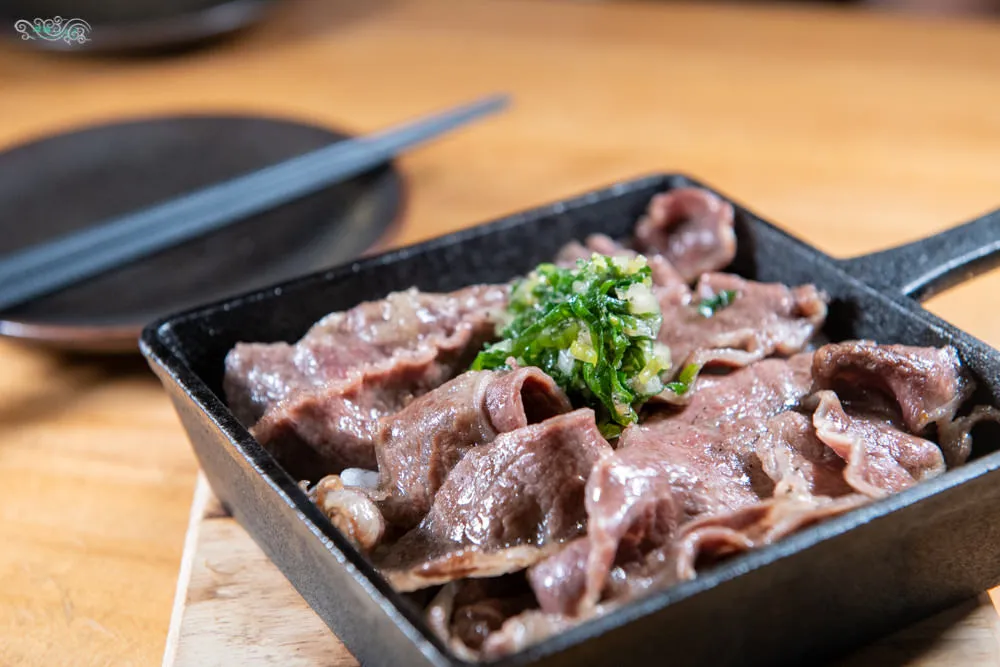 安格斯牛小排經過鹽烤過後,上方鋪滿鹽蔥,下方鋪的是洋蔥切片,馥郁的香氣一上桌就刺激嗅覺,火侯掌握得恰到好處,鮮嫩多汁的牛小排只用鹽烤提味,細緻綿密的油花在舌尖化開,那豐富的味覺層次,嚐起來韻味與嫩度十足,再加一點點適度的鹽蔥,讓牛肉嘗起來更為柔嫩甘甜,鹽蔥若加太多,凌雲就覺得有點過鹹,但是友人卻加了大把鹽蔥,直說這樣才夠味,若再加上洋蔥切片一起入口,凌雲很喜歡這味道的厚度。