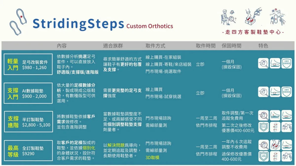 圖|走四方鞋墊成人的價格與分類,內容說明清楚。圖片取自走四方訂製鞋墊官網