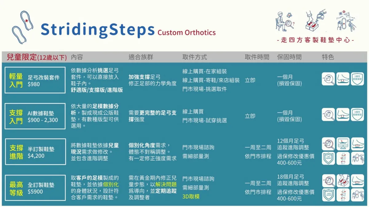 圖|走四方鞋墊兒童限定的價格與分類,內容說明清楚。圖片取自走四方訂製鞋墊官網