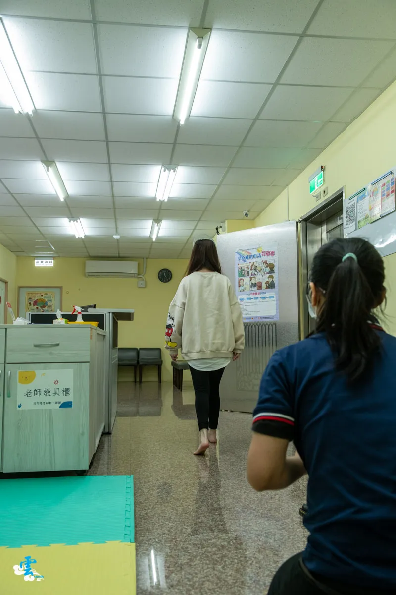 確認完小腿與足部的狀況後,物理治療師會檢視骨盆、脊椎與雙腿的相對位置,然後雙手輕搭在女王的骨盆上,跟著女王來回走個數次,然後再請女王獨自來回走個數次,主要是觀察走路時身體的協調與對稱性,之後物理治療師則依據豐富的經驗與專業的知識,詳細的說明了女王走路時的姿勢與出力狀態,判斷女王因為雙腳肌力不足,導致其他部位的代償,從而導致足底與小腿的不適。同時針對女王的腳型與狀況,物理治療師給予未來選購鞋子時,需要注意的重點,這點真的很棒。