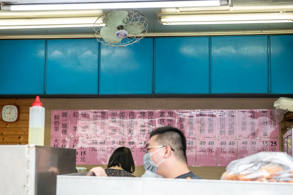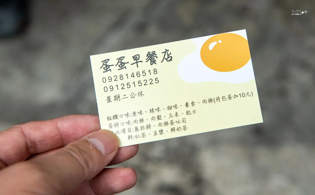 蛋蛋早餐店的菜單直接貼在牆上,想點什麼就看著牆上菜單點就好,販售的主力是多口味的粉漿蛋餅與飯糰,其中肉排蛋餅跟肉排飯糰是網路上獲得一致推崇的品項。