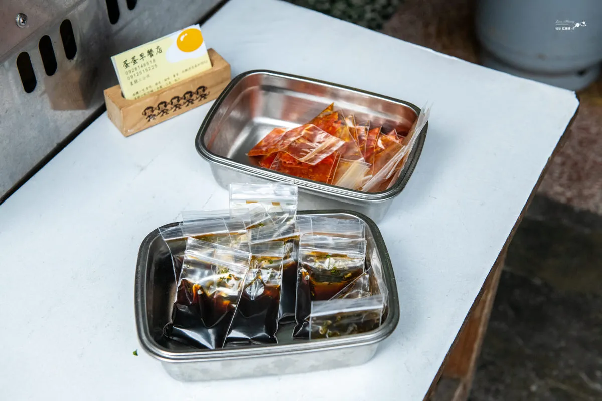 店家自製的辣醬包與醬油包,皆是自行取用,不得不說店家很用心也有很誠意,醬油內含香菜末,而辣醬則外加了蒜末,不只讓香氣更有層次,也豐富了調味。