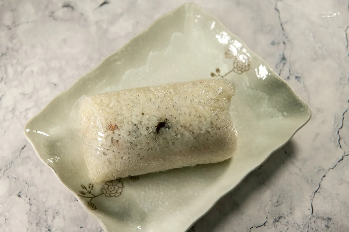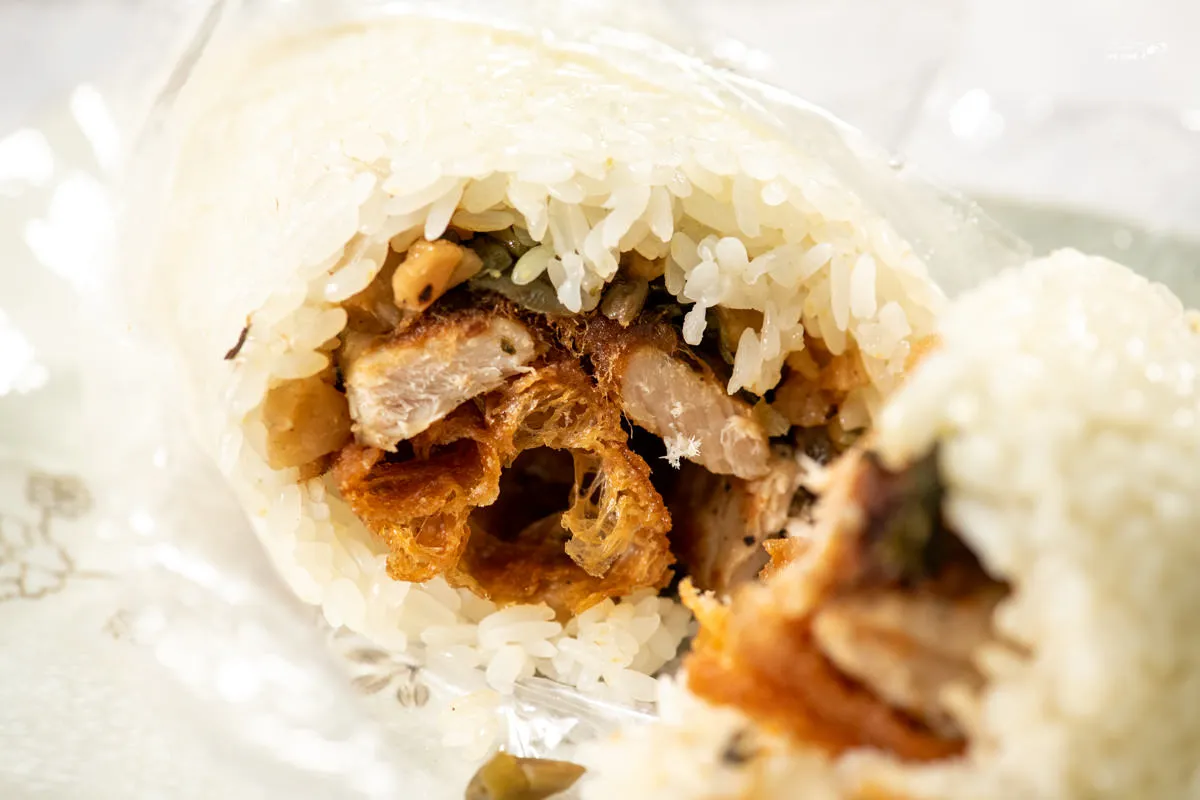 飯糰大小跟剛剛的蛋餅盒子相當,內容物有酸菜、菜脯、肉排、油條與肉鬆等,都是很標準的配料。酸菜與菜脯特有的沉穩酸鹹香氣,兩種不同程度的微酸在咀嚼中愈發濃郁,卻不會喧賓奪主,反而凸顯出厚實肉排的嫩與咬勁,饒富咀嚼樂趣,肉鬆與油條豐富了口感層次與風味,難怪在網路上得到極高的評價。