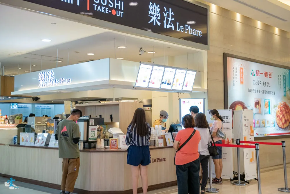 樂法Le Phare 市府店位在市府轉運站內,距離統一時代百貨入口才幾步路程,不論是搭車、轉車或是逛街,都別忘了來上一杯樂法精心準備的飲品。樂法使用溫潤的淺色木質作為櫃台的主色,桌面與底部則選擇深色木質展現醇厚典雅的質感,相近色系的招牌字樣在淺色木質上更加醒目,上方以明亮的白色為基底,佐以高亮的招牌營造視覺亮點,相較於其他櫃位,樂法Le Phare著實吸睛又具美學效果。