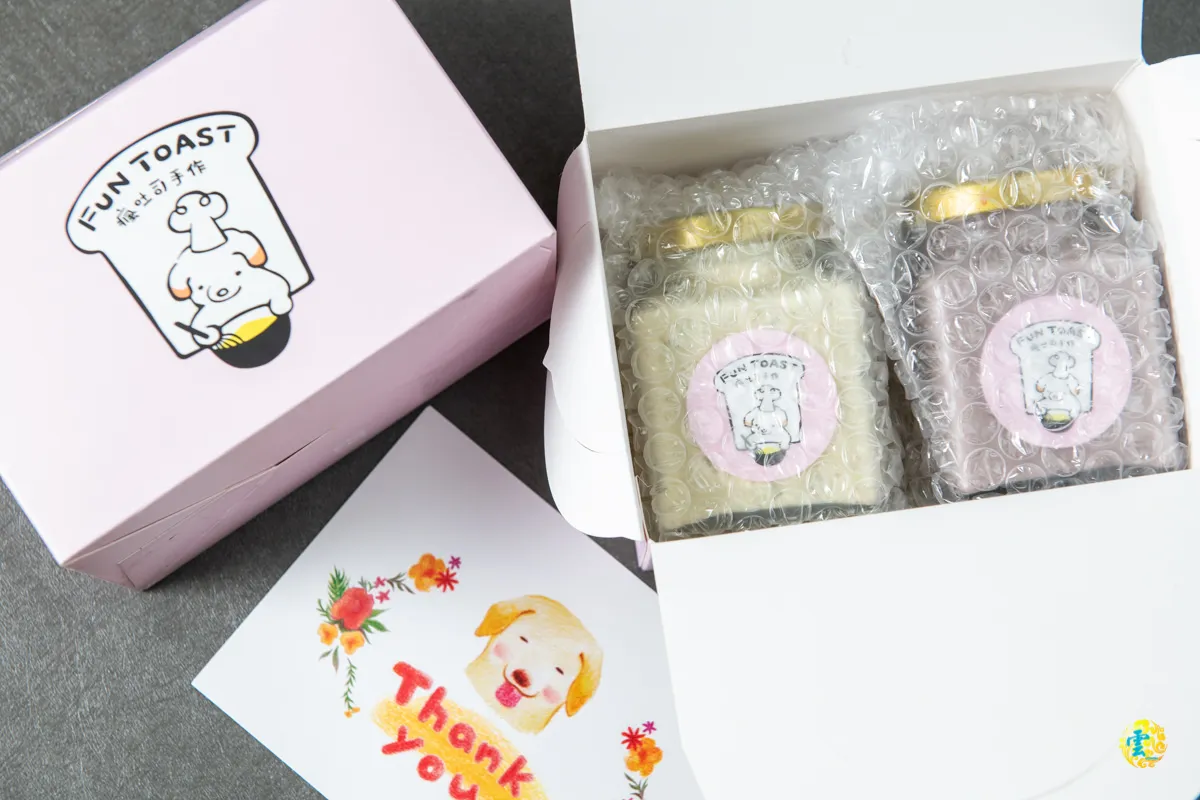 FUN TOAST 瘋吐司手作堅持純手工製作,才能嘗到美好的滋味,不添加防腐劑,所以建議開封後盡快食用完畢。粉紅色的外盒包裝,加上萌狗廚師的圖案,小凌雲看了超喜歡,背後的吐司圖案直接點名主題。
