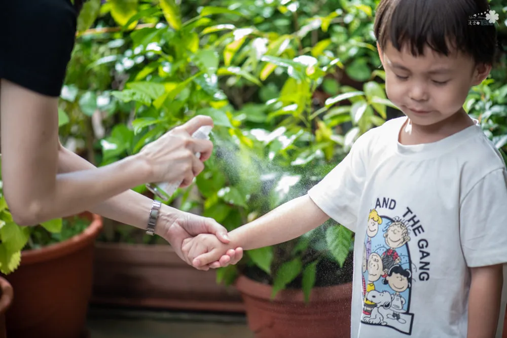 不含DEET、香精、酒精、塑化劑、Paraben、Phenxyethanol的HH寶貝抗菌防蚊液,由檸檬桉精油萃取,成分溫和安全擁有淡淡清新的檸檬香氣,小凌雲不會抗拒被噴,使用前先上下搖晃,在均勻的噴灑在肌膚跟衣物上,防蚊時間可達兩個小時,這也差不多剛好是小凌雲午後玩樂活動的總時間,所以沒有需要補噴的煩惱,難怪深得女王喜愛,方便又安心。