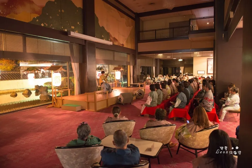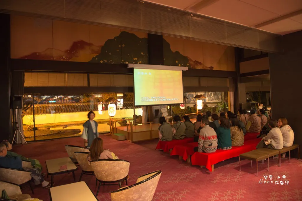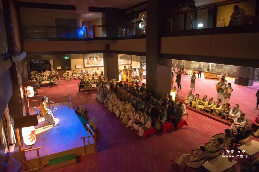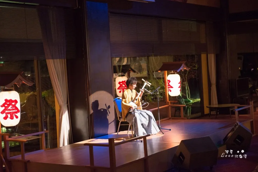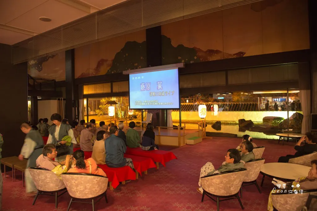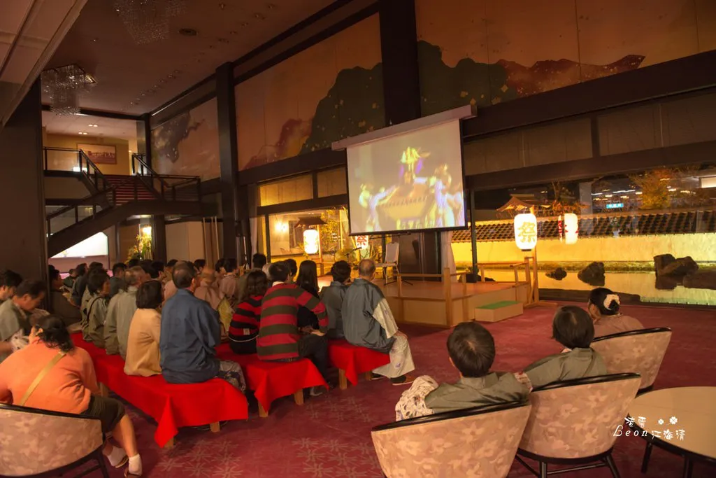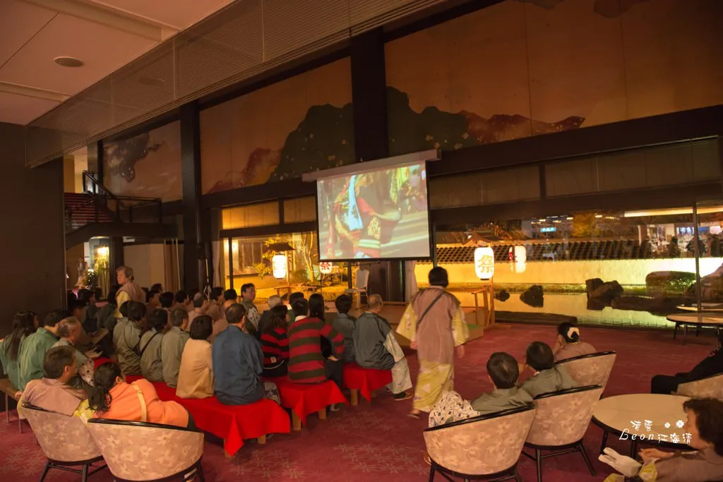 當用餐完畢,飯店人員會幫你將床鋪好。用完晚餐後約七點半,飯店準備了三弦琴的表演,約莫七點左右,就蠻多遊客已經在等候表演了,在等候的時間,屏幕會播放一些當地祭典的片段。