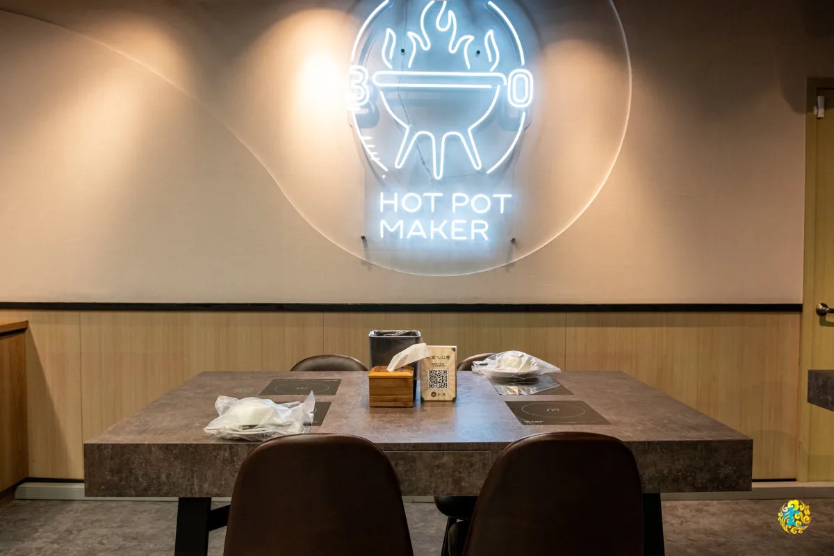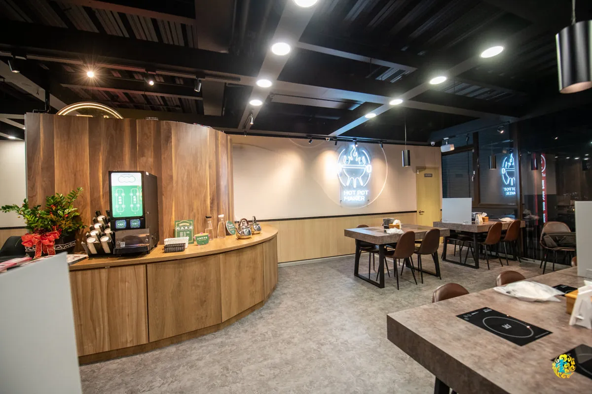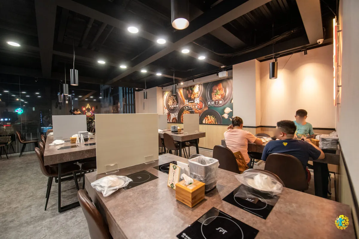 輕工業混搭Loft風格的裝潢,一向受到火鍋店家的青睞,狂一鍋也是。黑色鐵件天花板,配上暖色系牆面與灰質地板,對比色強化視覺感受,也有助提昇空間的層次感,大片落地窗的設計帶來明亮的採光,也延伸了整體的視覺感受,暖色系吊燈、投射燈以及溫潤的木質元素,為用餐空間帶來溫暖感受。寬敞空間與動線設計,讓整體視覺氛圍更有流通性與廣闊感。
