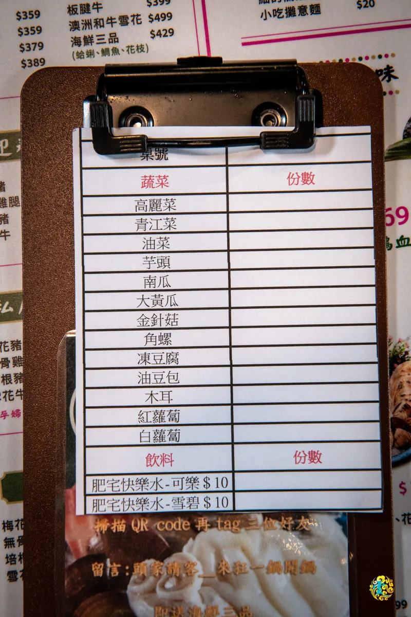 除了可樂與雪碧是一瓶$10元,需要額外付費,其餘都是免費無限供應。狂一鍋提供蔬菜吃到飽服務,想點甚麼直接畫單交給店員即可,當點的蔬菜送上鍋時,店員會再次附上新的點菜單。