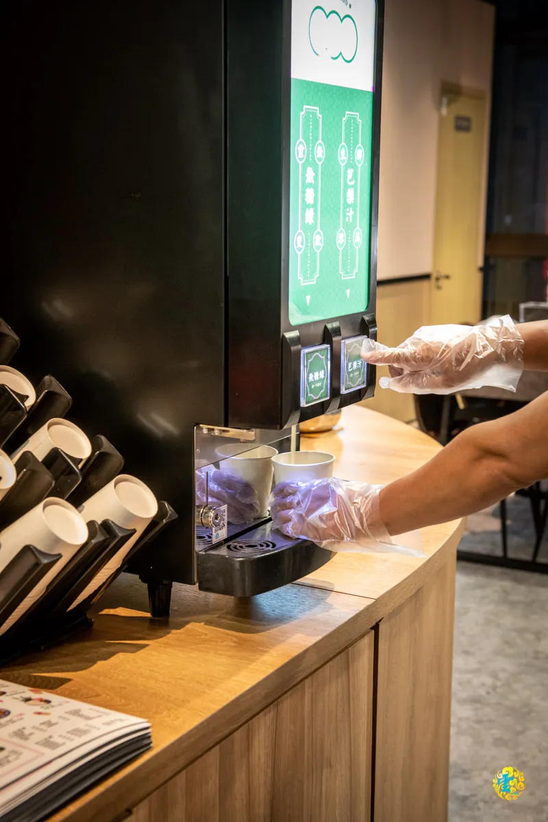 疫情期間,店員會讓你先抽一付免洗手套,戴好手套在使用醬料吧與飲料吧,目前提供免費的無糖綠茶與芭樂汁。以前流水席上最常見的飲料就是芭樂汁了,狂一鍋真的很用心,連這一個小細節也注入了滿滿的台味。
