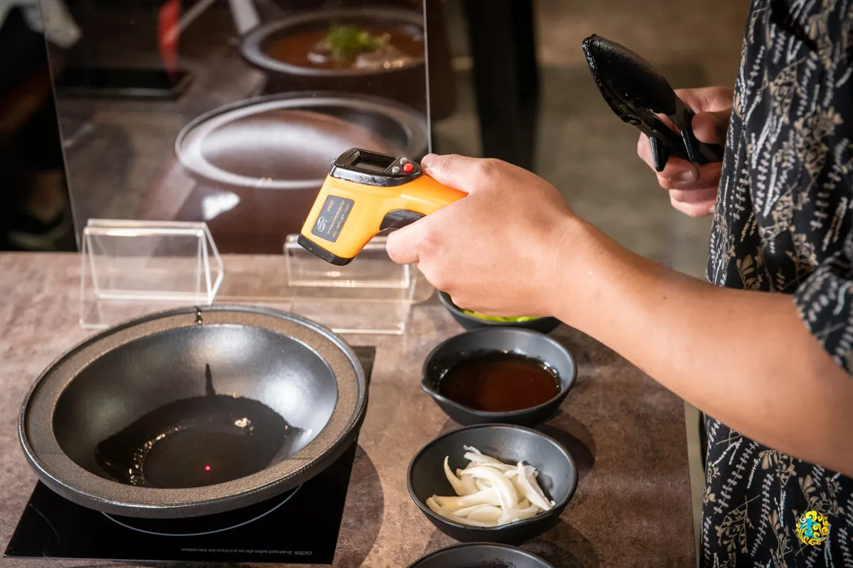 圖|10CC的豬油會加熱至超過150度C才開始爆炒,店員會使用儀器測量確認實際溫度。