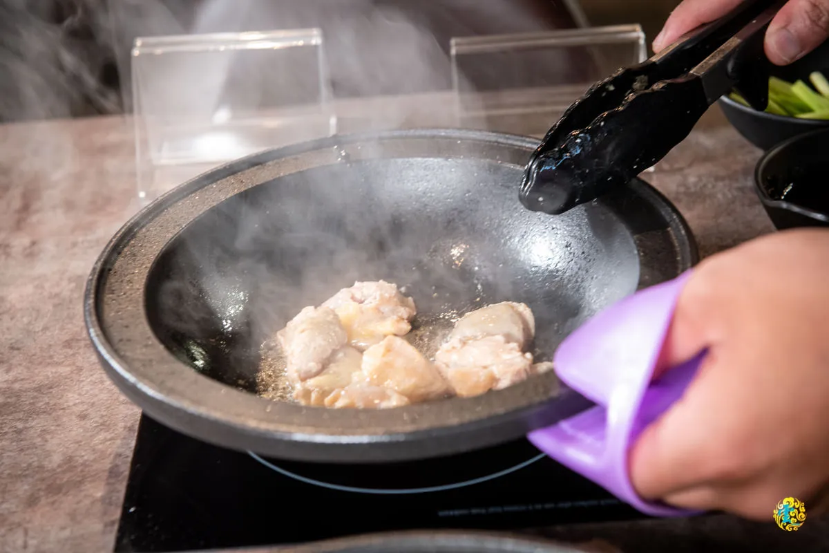 點酒香花雕雞鍋,會提供桌邊爆炒的服務,開始爆炒服務時,店員會在桌邊貼心的放上隔板,以避免噴濺。店員一開始會先倒入10CC的豬油,加熱至油溫超過150度C才開始爆炒,過程中還會使用儀器測量確保溫度有超過150。爆炒過程中散發的高溫香氣,馥郁迷人。雞肉的部分會煎到表層赤色後,加入洋蔥開始爆炒,炒到洋蔥微微有點透的時候,加入蒜末爆香,接著倒入花雕醬與花雕酒,此時豐厚的香氣逼人。最後店員會蓋上鍋蓋悶一下,目的是讓雞肉熟透。