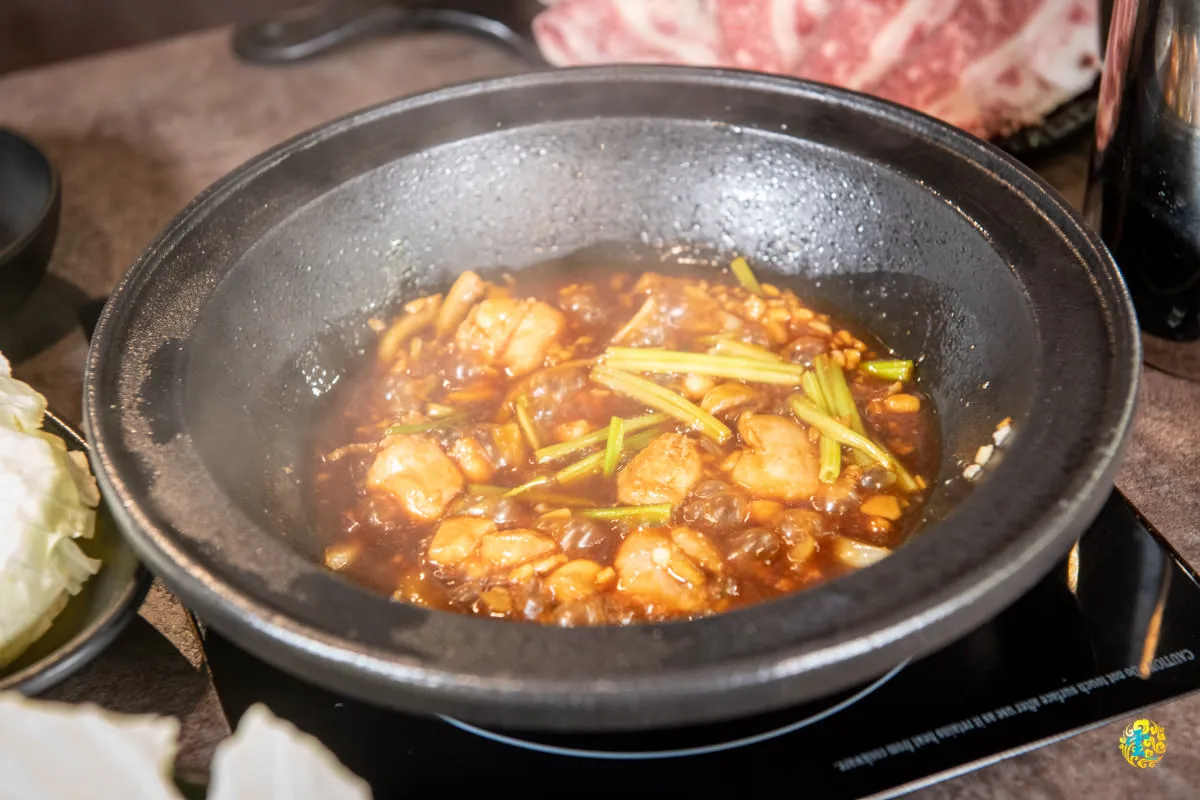 芹菜等配菜除了增加香氣也多了爽脆,看起來油花焦香,聞起來淡淡蒜香,嚐起來豐富多層的風味。花雕雞的香氣很濃郁很香,雞肉不柴入味夠軟,酒氣很香,咀嚼中才有很淡的酒味浮現。私房酒香花雕雞鍋以雙重風味刺激嗅覺,再以軟嫩油潤包覆味蕾,將鮮度發揮到極致。