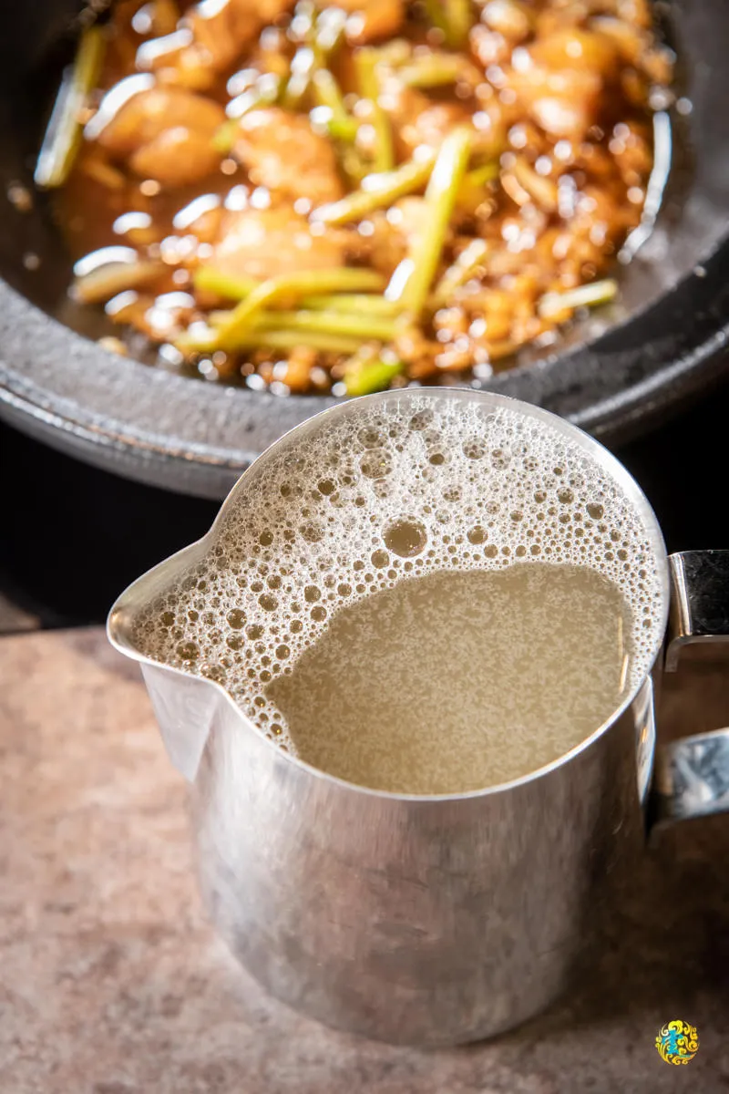 花雕雞鍋提供兩吃,爆炒完先吃雞肉,之後再加入額外附的湯頭,湯頭本身是大骨湯再加入20CC的花雕酒,所以湯頭記得要煮開再喝。加入湯頭後,酒味與香氣更加濃郁。