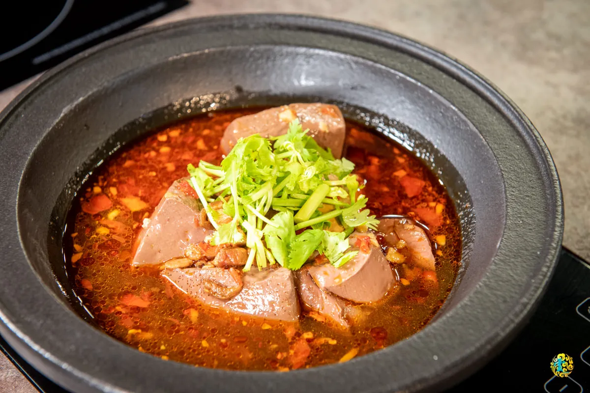 店員會詢問要不要放香菜,在這鍋還未煮開之前,基本上都是花雕雞鍋的香氣,但在麻辣臭豆腐鍋煮開之後,嗅覺感覺全被臭豆腐鍋佔據了,厚實濃郁的香氣在鄰桌都能感受到。辣度凌雲覺得還OK,大概是一般的小辣程度,不帶侵略性的辣度感受,也不會累積那種辣度,所以不會越吃越辣。湯頭太濃或太淡,店員都可以協助調整。輕辣甘潤的湯頭,豆腐與鴨血軟嫩入味,聞起來香,嚐起來辣,整體口感豐厚。