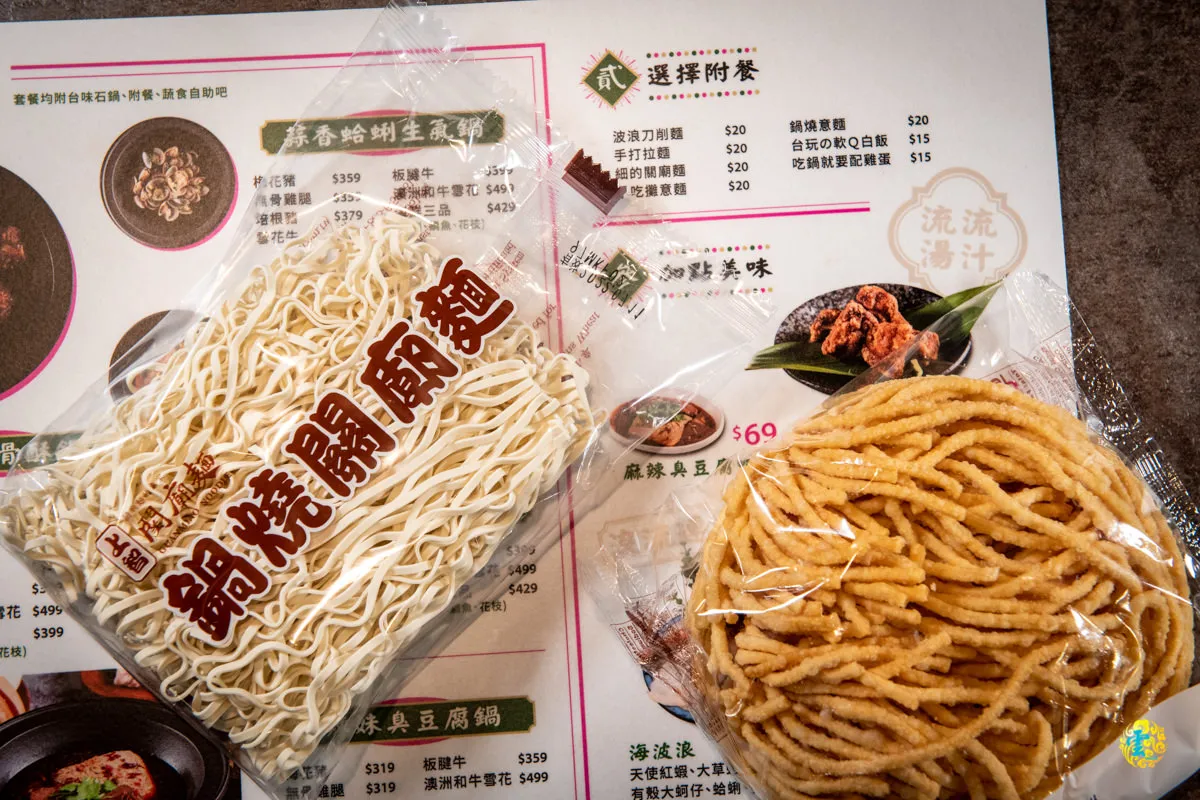 嚼勁十足的關廟麵皆由日曬法製成,狂一鍋給你多種選擇。加入鍋燒意麵,豐富了滋味與口感 進階玩轉風味變化。如果喜歡軟爛口感就煮久一點,因為意麵本身就帶有鹹度,放入意麵後的湯頭,如果覺得有點鹹,可以請店員協助調整。