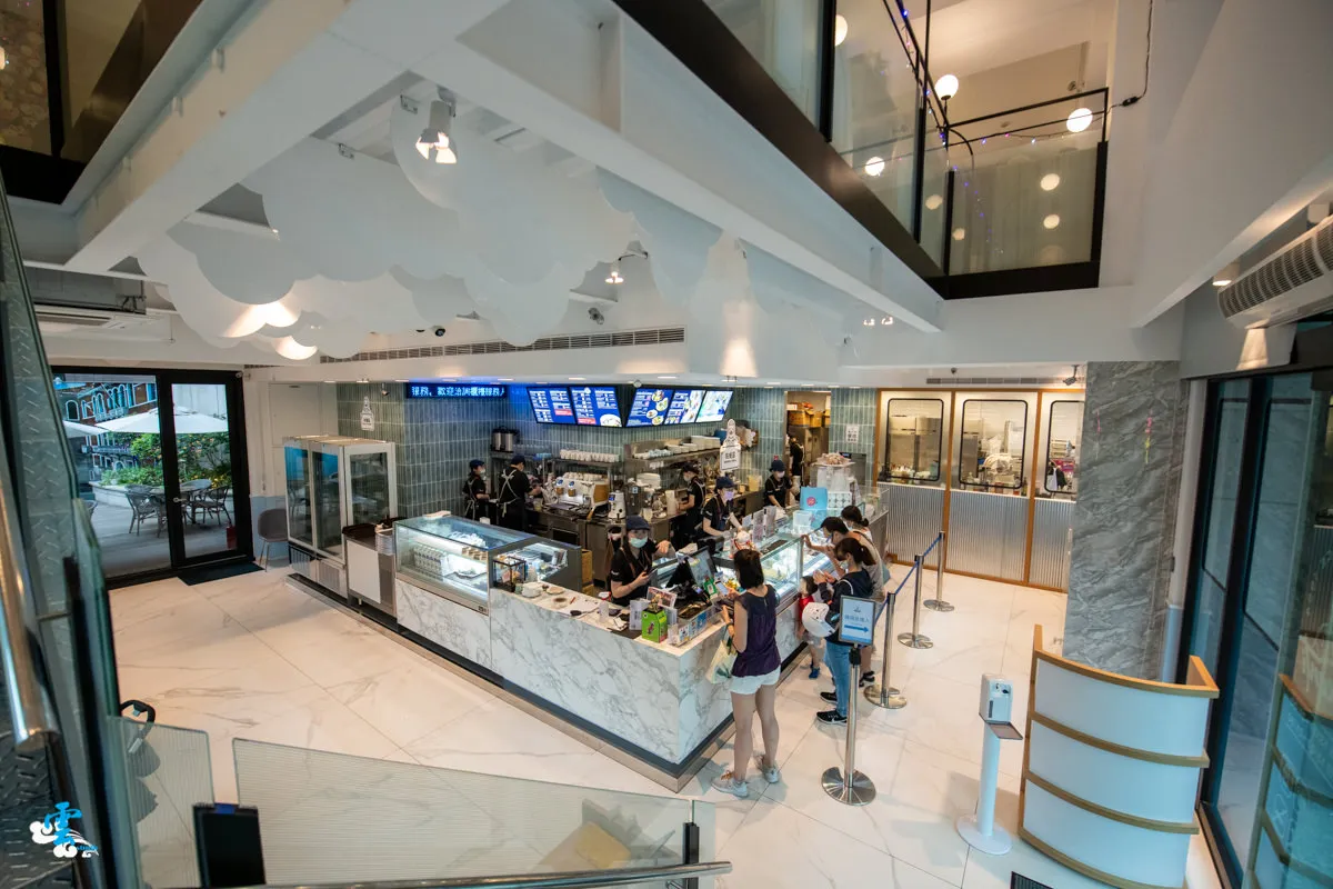 一樓採大面積的落地窗,加上前段挑高的設計,營造一個全景視野的俐落吸睛感受,也帶來充足的光線。室內裝潢以白色為基底,櫃檯後方則大膽的以綠色的磁磚,創造對比也凸顯了視覺的層次感,接著混搭大理石紋路的地板與牆面,打造如山水畫般的輕奢感受,透過幾何線條簡單的延伸與搭配,隨性的展現空間之美,