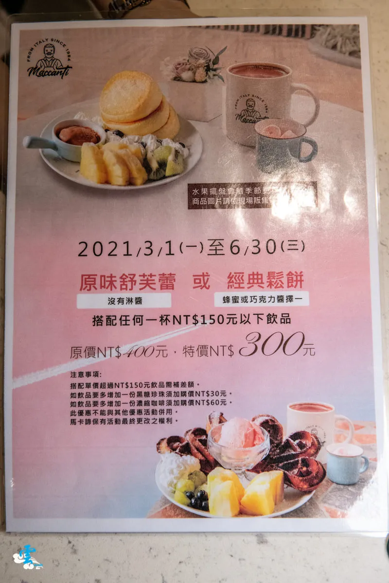 不定期推出的下午茶套餐組合,這次來訪,店家推出的是原味舒芙蕾、經典鬆餅套餐還有提拉米蘇套餐,因為採訪完就遇上疫情三級警戒,近期推出的下午茶套餐組合,請見Maccanti馬卡諦義大利冰淇淋臉書粉絲頁。