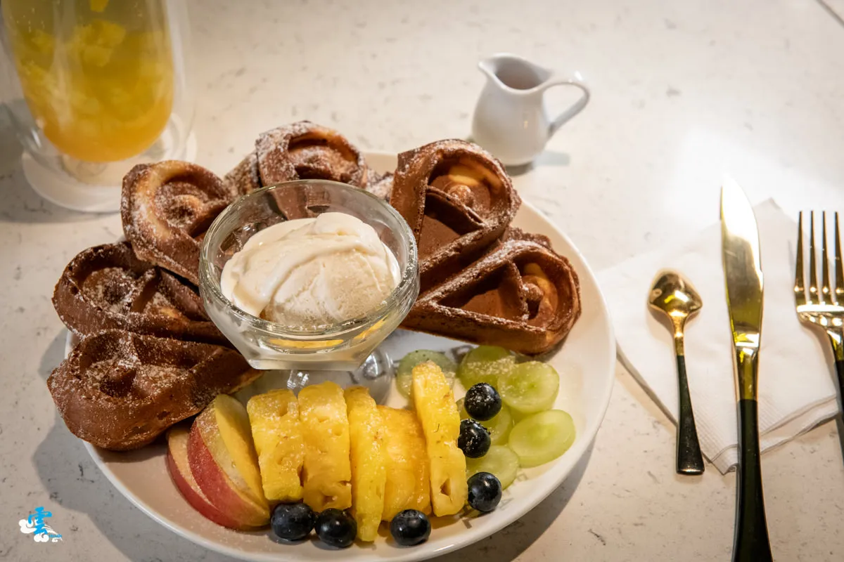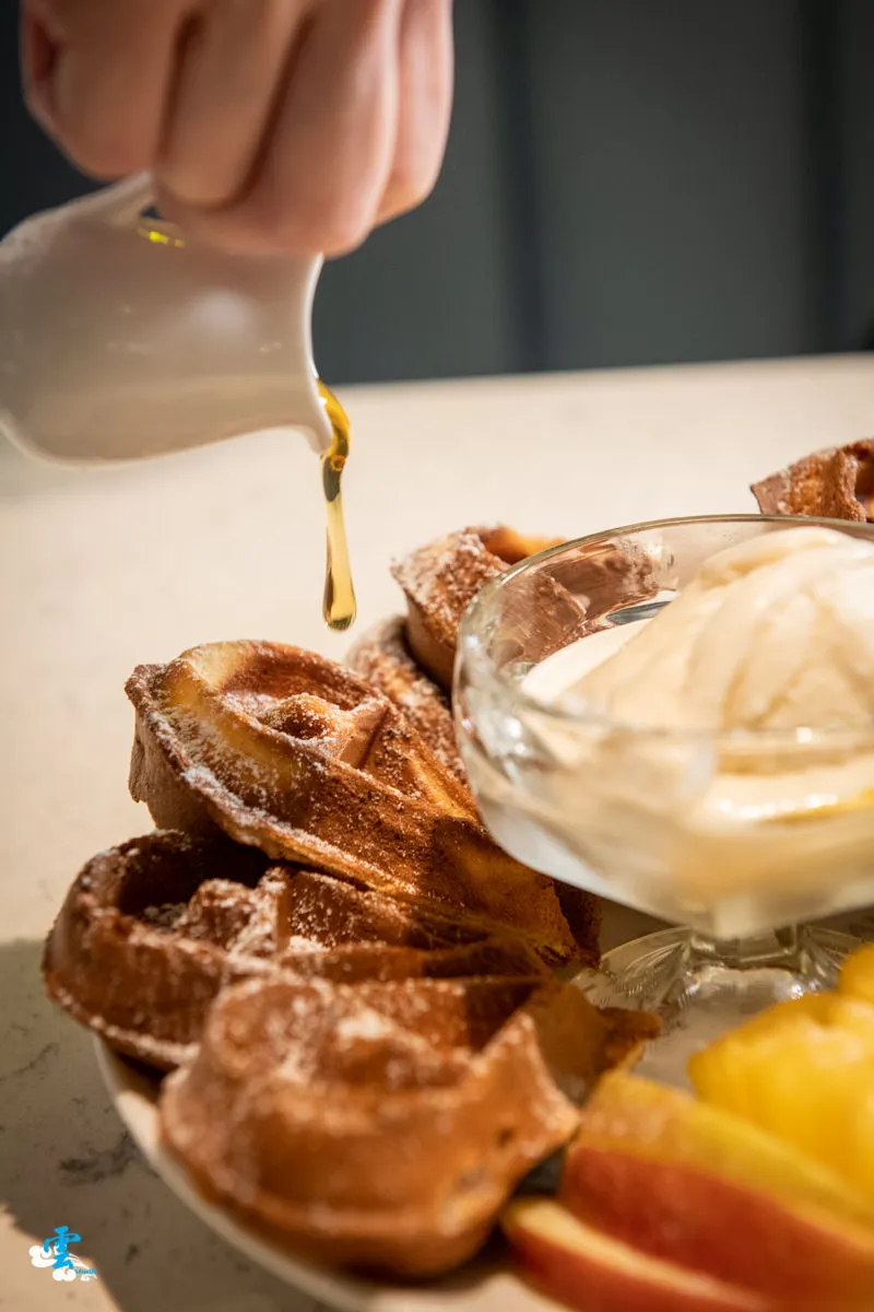 經典鬆餅可任選任意口味的冰淇淋,並搭配季節水果。女王選擇的是杏仁堅果冰淇淋,還未入口,濃郁的杏仁味毫不客氣的侵襲嗅覺,然後在嘴裡慢慢散開,小顆粒的杏仁堅果彷彿小精靈般,在嘴裡恣情跳躍,豐富滋味中暗藏層層驚喜,十分引人入勝。愛心形狀的鬆餅,有著豐腴的麻糬內餡,很驚喜的口感,邊邊脆口滋味,觸動著舌尖的末梢神經,甜蜜直攻心頭。
