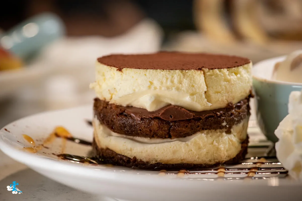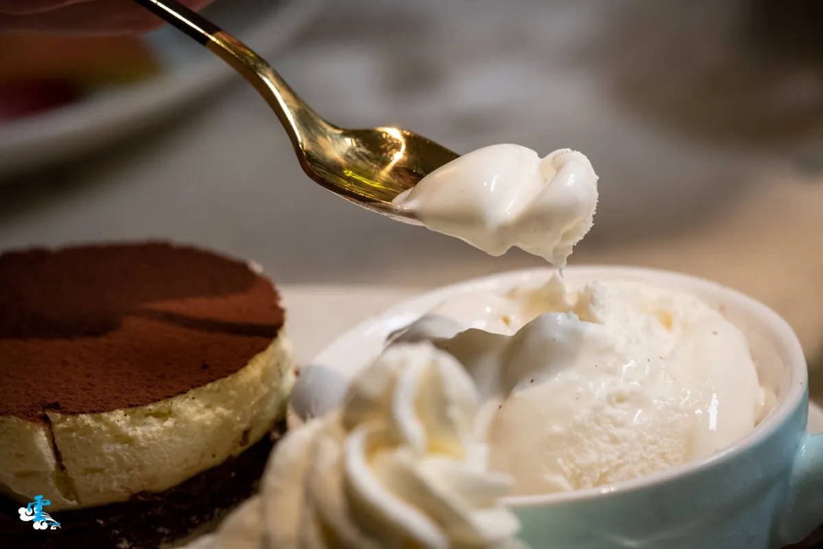 套餐內含一杯咖啡、一份提拉米蘇、一球冰淇淋與奶油。女王選擇的口味是松子蜂蜜冰淇淋,馬卡諦松子堅果口味冰淇淋,所使用的松子風味醬是特地從義大利進口的,成本昂貴。富含油脂的松子跟蜂蜜很搭,顆粒口感很加分,饒富咀嚼樂趣,馥郁的松子香氣中,潤和淡淡的牛奶香味,落喉時帶著一絲蜂蜜尾韻,如果不是前面吃太多了,凌雲真想再來一球。Mascarpone起司、糖與蛋黃處理的非常好,讓提拉米蘇展現十足的輕柔感,最底下的餅乾為整體味覺賦予了美妙的層次,可可粉強烈的香氣刺激嗅覺,入口滑順細柔隱含咖啡的苦澀,底層有巧克力與焦糖網狀交織,帶出視覺與味覺的層次風味 每一口都有數不完的驚喜與好感。