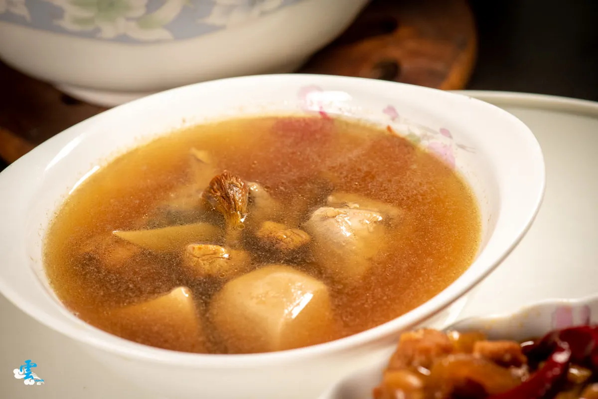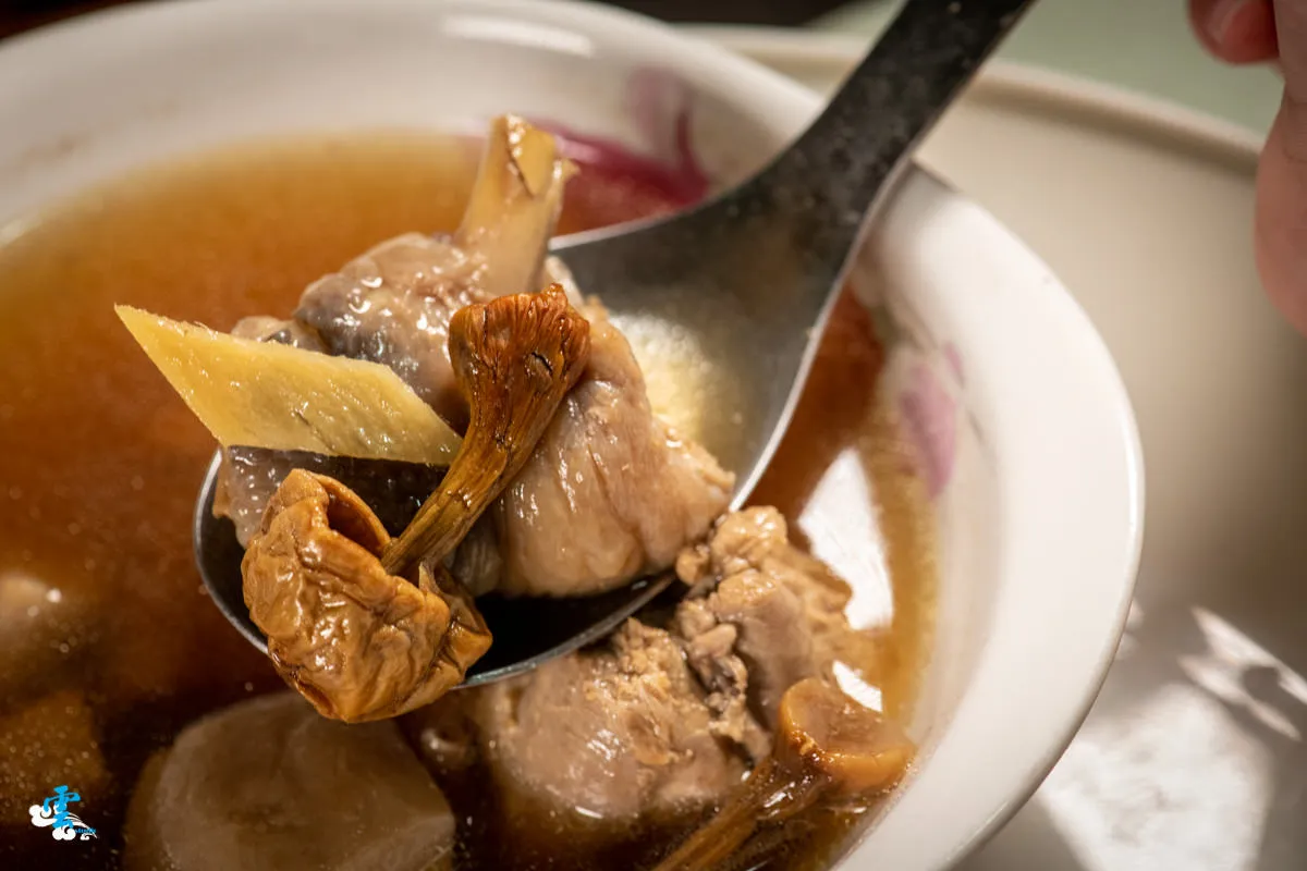 醇香馥郁的橘色雞湯是熬煮多時的成果,淺嚐一口湯汁,那份清甜鮮味在嘴裡橫衝直撞,厚實爽脆的巴西磨菇與嫩甜的雞肉,在咀嚼中滋味越發濃郁,醇厚的湯汁不甘示弱的回甘,這味道的厚度相當立體。