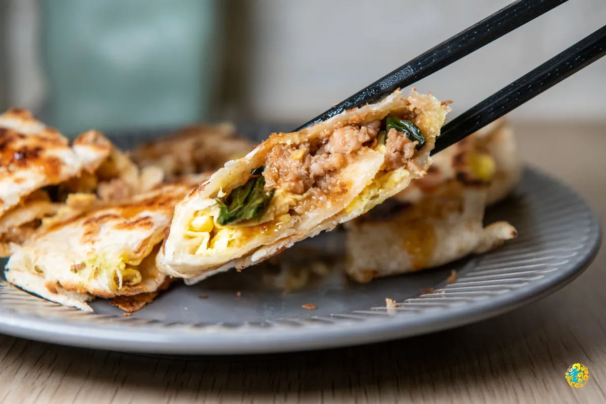 翻開蛋餅會發現裡面滿滿的肉鬆,在翻動的同時還可以聞到淡淡的肉香味,咀嚼中肉香、蔥香與蛋香交疊,鹹甜鹹甜的美妙層次令人回味。