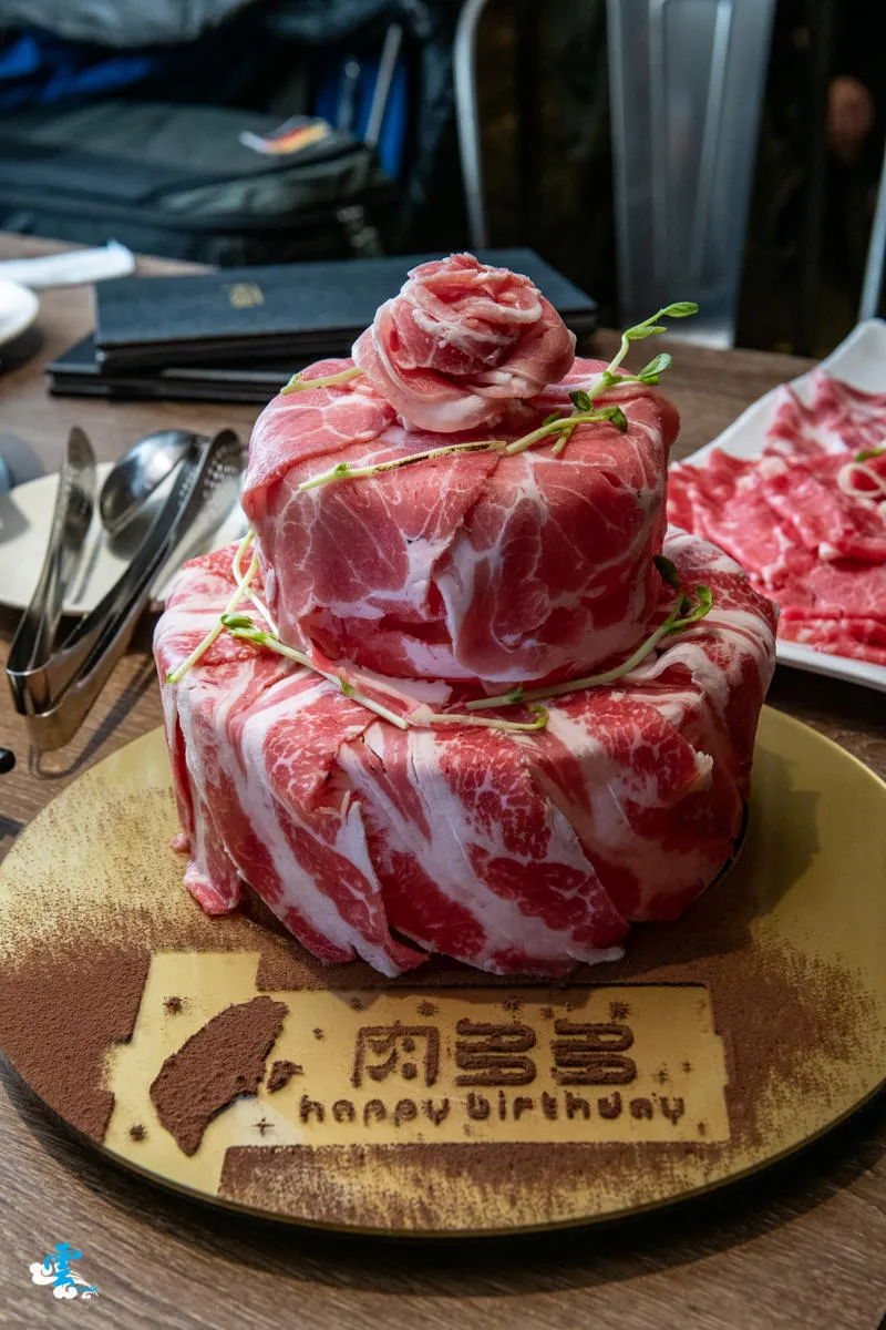 下面那層是雪花牛,上面那層跟上面那朵花是活菌豬,如果不吃牛的話,店員表示可以換成全豬。雪花牛紅白相間的大理石花紋十分誘人,活菌豬肉質爽脆彈牙,口感極佳,真的是相當有誠意又豐盛的肉多多浮誇肉蛋糕